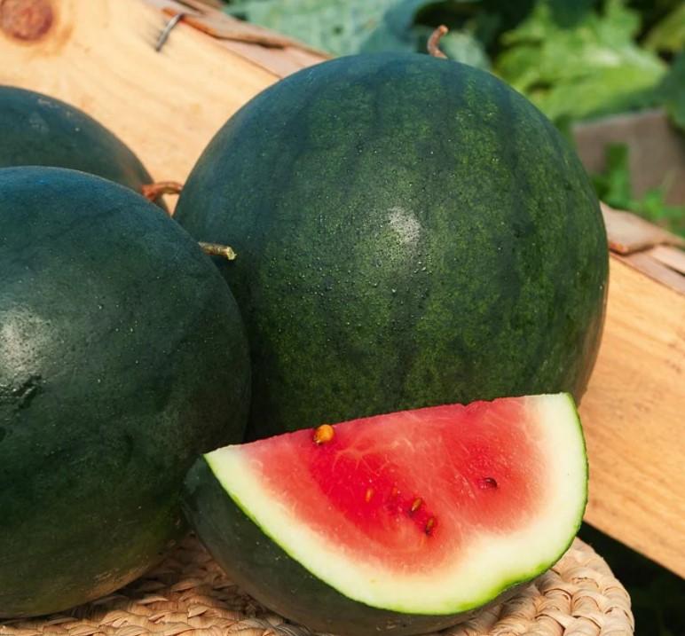 Plant de pastèque Gros fruits verts striés de vert clair, très légèrement allongé, d'environ 10 kilos. Chair rouge foncée, juteuse et sucrée.