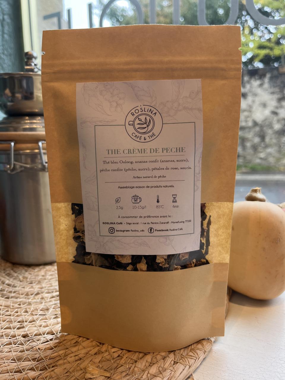 Ingrédients : Thé bleu, morceaux de pêche, cubes d'ananas, pétale de rose, arôme naturel de pêche
