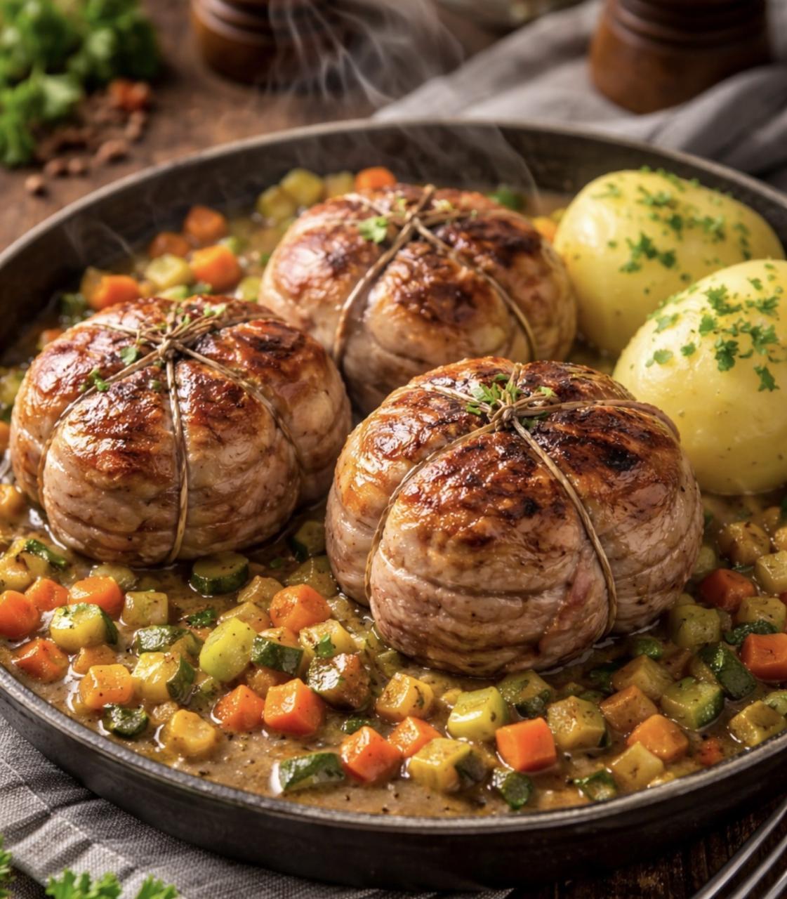 Tranche d'escalope fine emballant une portion de farce, la paupiette de porc peut être accompagnée de diverses sauces traditionnelles.