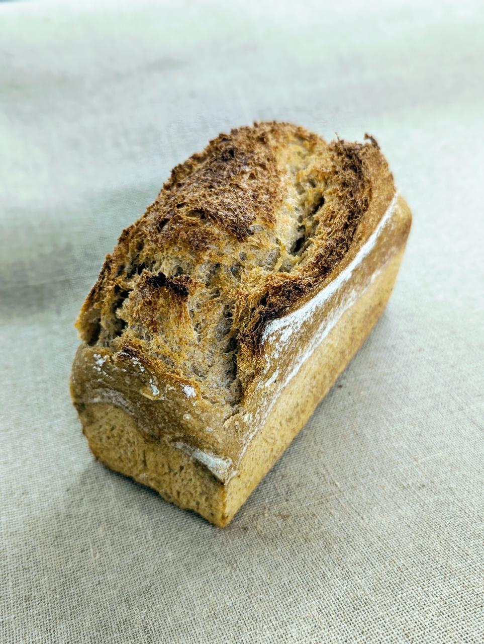 Notre pain complet est exclusivement levé au levain naturel, sans ajout de levure. Ce choix de fermentation lente permet de développer des arômes profonds et complexes, tout en augmentant la digestibilité du pain. Le levain confère à la croûte une belle couleur dorée et une texture croquante, avec une mie moelleuse et fondante.