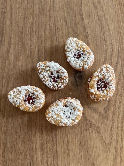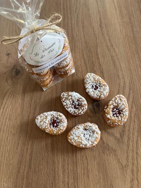 Délicieux sablés fourrés à la confiture de fraises faite maison et généreusement saupoudrés de sucre glace. En forme d'oeuf, ils seront idéals avec le café le jour de Pâques ou pour une décoration gourmande de votre table de fêtes !