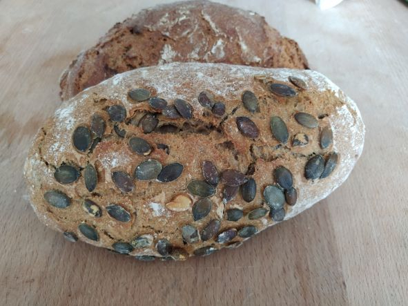 Ingrédients : Farine de blé T 80 Bio, levain, eau, sel de Guérande,graines de courges.