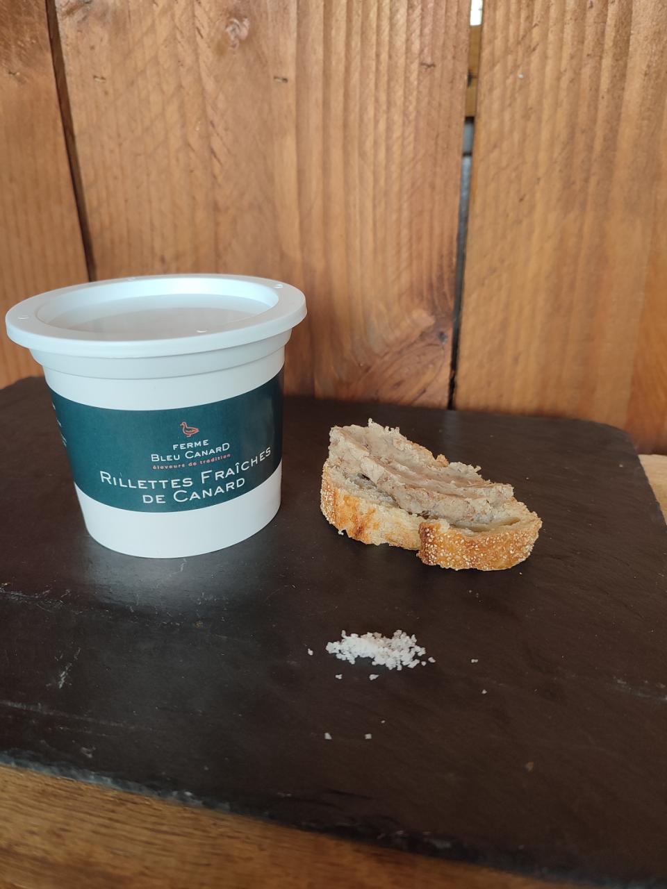 Ces rillettes c’est 100% de la viande de nos canards. Pour de bonnes rillettes il faut une viande goûteuse, celle du cou, des ailes et de la carcasse que l’on confit dans la graisse de canard pendant plusieurs heures puis que nous désossons à la main. On y ajoute du sel de Guérande et c'est tout.