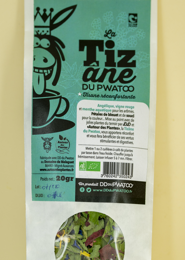Aussi loufoque que délicieuse, découvrez notre Tiz’âne du Pwatoo, fruit d’une collaboration locale avec DD du Pwatoo, première marque identitaire pwatevine ! Les jolies plantes du terroir composant cette délicieuse tisane vous apporteront joie et réconfort tout en vous faisant bénéficier de leurs vertus stimulantes et digestives. Faites vous plaisir avec les arômes surprenants de ce mélange qui feront des cabrioles sur vos papilles et ses folles couleurs qui raviront vos pupilles ! Venue tout droit du Pwatooland, elle sera idéale pour les Pwatevins en mal du pays et pour tous les amateurs de tisanes aux accents folkloriques !