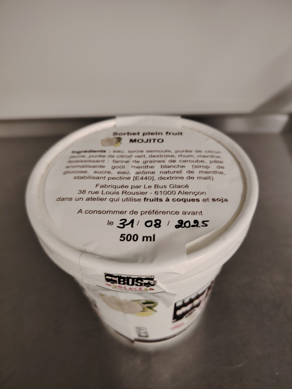 Surgelé Durée de conservation : 16 mois Ingrédients : Eau, sucre semoule, purée de citron jaune, purée de citron vert, dextrose, rhum, menthe, épaississant : farine de graine de caroube, pâte aromatisée goût menthe blanche (sirop de glucose, sucre, eau, arôme naturel de menthe, stabilisant pectine {E440], dextrine de malt).