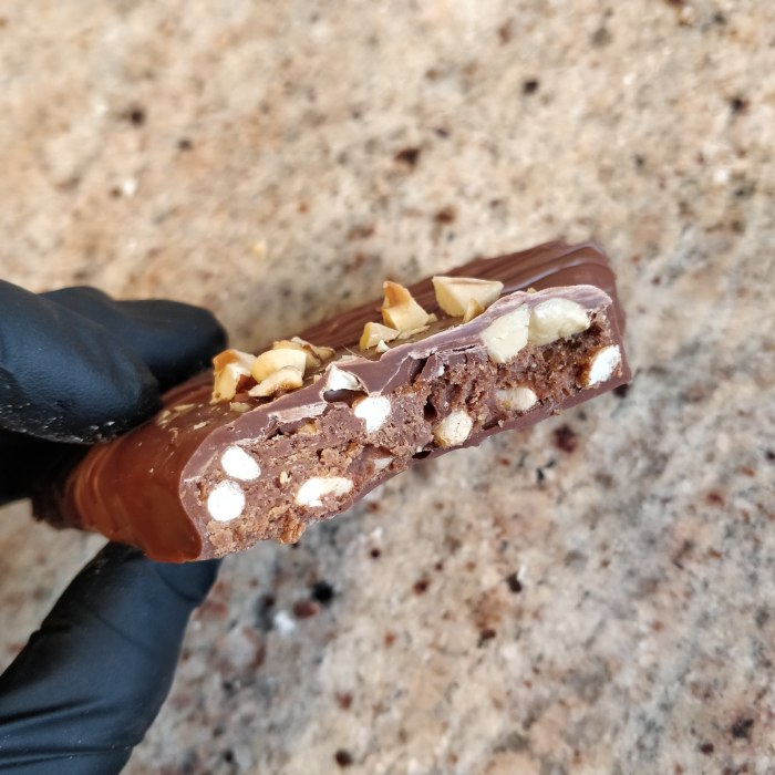 Ingrédients : Chocolat noir (fèves de cacao de São Tomé-et-Principe, sucre de canne, beurre de cacao, émulsifiant : lécithine de tournesol), noisettes (Lot-et-Garonne) 29,9 %, sucre, chocolat au lait (sucre de canne, lait en poudre, beurre de cacao, fèves de cacao, lécithine de tournesol, fleur de sel), crêpe dentelle (farine de blé, sucre, beurre concentré, sucre de lait, protéines de lait, sel, extrait de malt d'orge, poudre à lever : bicarbonate de sodium), riz complet soufflé, fleur de sel.