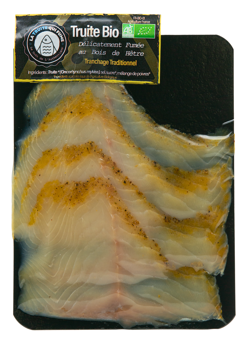 Élevée dans les eaux cristallines du Parc naturel du Vercors, notre truite blanche biologique n’est pas colorée artificiellement par son alimentation. Fumée selon la technique de fumage par friction de bûche, elle révèle des arômes d’une grande subtilité. Plus fondante et racée, cette truite blanche développe de délicates notes de noisette en fin de bouche.