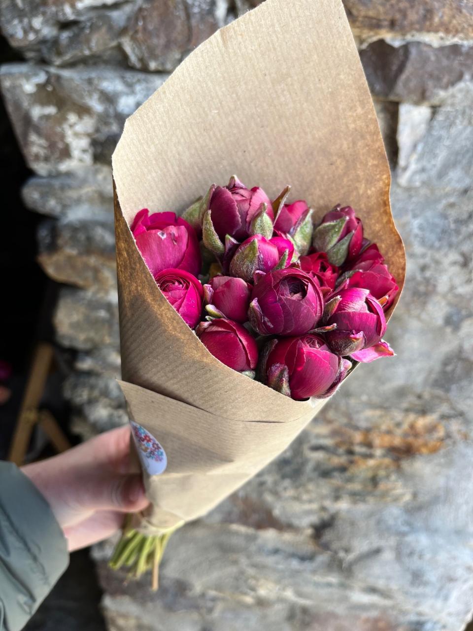 Je propose la botte de fleurs composée de fleurs de saison : les renoncules de ma propre production (x 8 tiges).