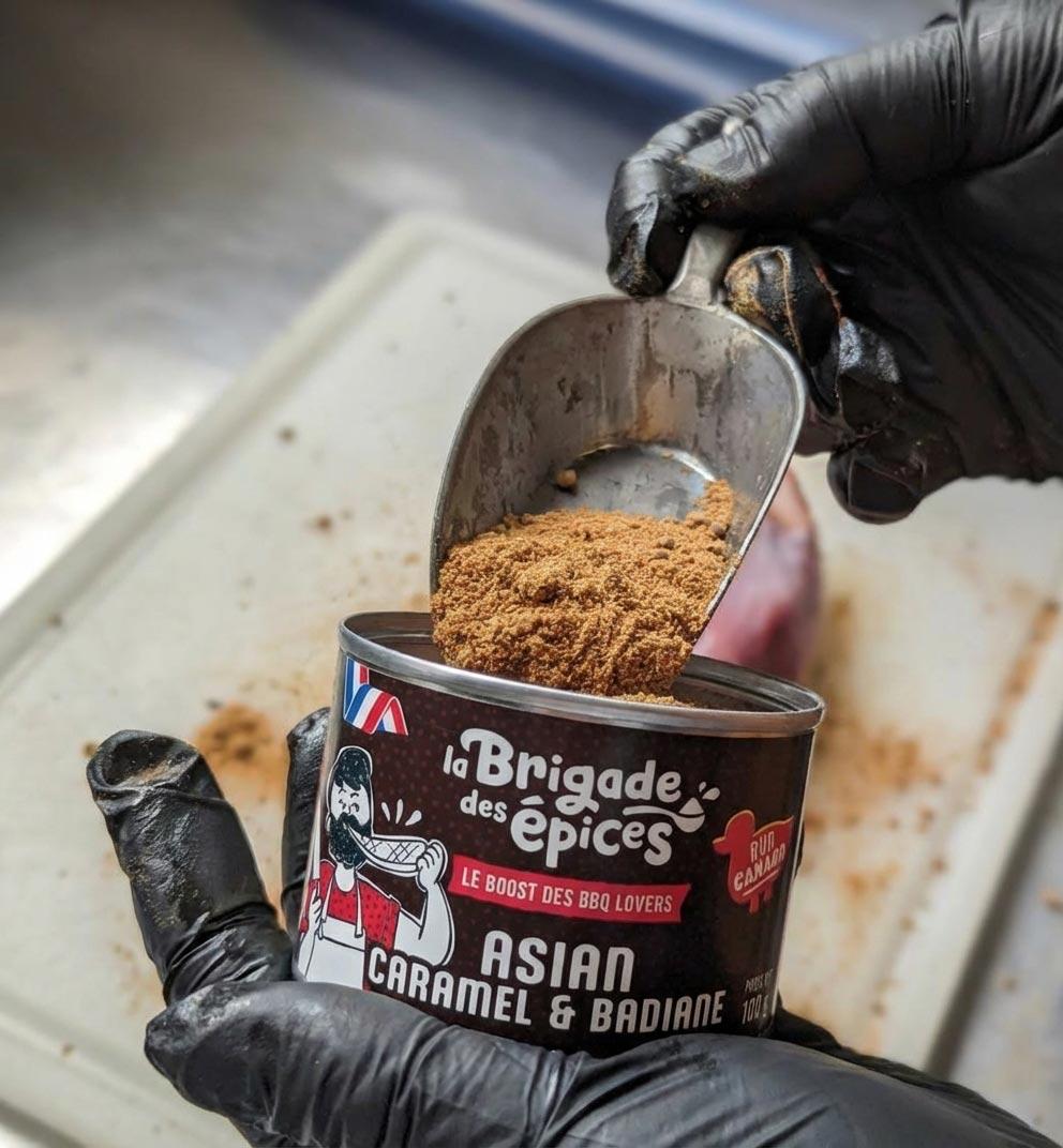 Ingrédients : Sel de camargue, Épices et Aromates (Coriandre, Oignons grillés, Gingembre 4%, Fenouil, Badiane, Paprika fumé, Poivre, Muscade, Girofle, Cannelle), Muscovado, Sauce Soja ( Soja, mais, sel, maltodextrine ), Caramel 6%, Zestes d'orange, Tomate