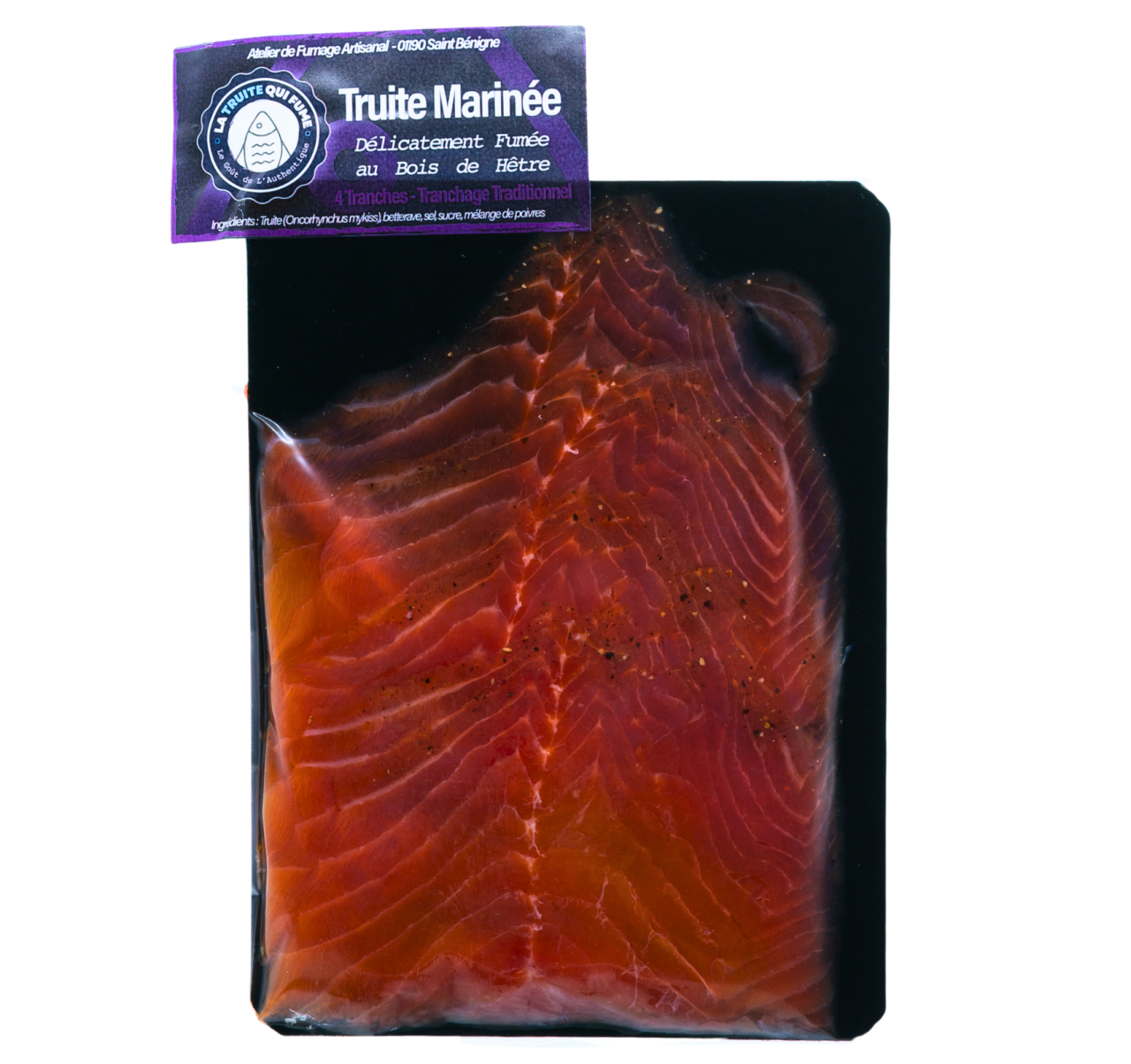 Allergènes : Truite (oncorhynchus mykiss) Conditionnement : Sous vide Durée de conservation : 30 jours Ingrédients : Truite (oncorhynchus mykiss), betterave, sel, sucre, aromates Colorants ou arômes : Sans colorant, sans liant, sans conservateur Origine : France