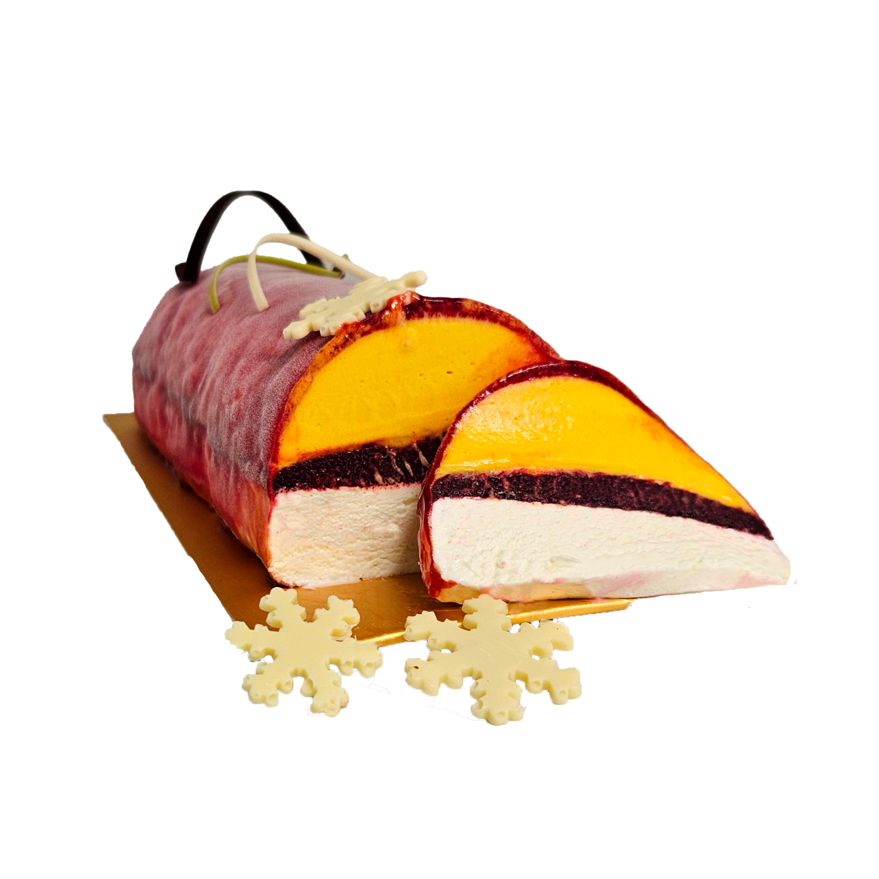 Sorbet mangue passion, gelée de cassis, crème glacée Vanille et glaçage fruits rouges.