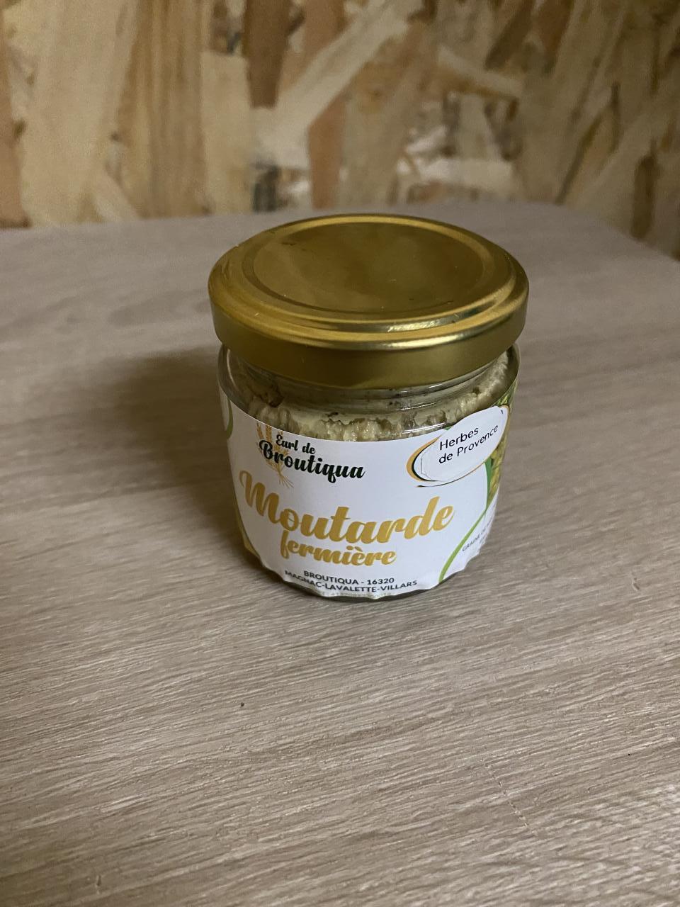 Conditionnement : Pots en verre Durée de conservation : 6 mois à partir de la mise en pots Ingrédients : Graine de moutarde blonde fermière, eau, vinaigre d’alcool, huile de tournesol, sel, herbes de Provence. Origine : Producteur