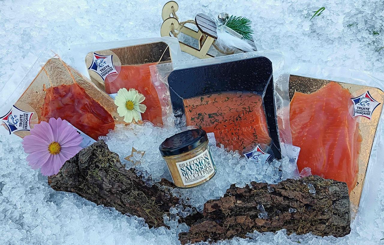 Notre panier Délices se compose de Truite fumée tranchée, de dés de truite fumée nature et au piment d'Espelette AOP, de gravlax de truite à l'aneth, à la menthe ou à la ciboulette ainsi que d'un bocal de rillettes de Saumon de l'Adour au citron.