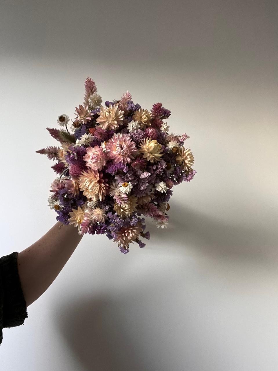Chaque bouquet est composé de variétés spécialement choisies pour le séchage : statice, gomphrena, célosie, ammobium et immortelle.
