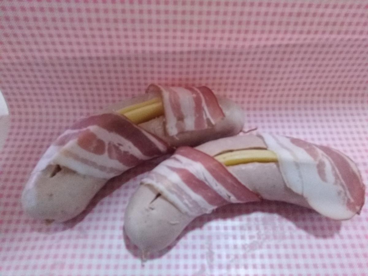La Saucisse Alsacienne est une Grosse Knack (chez nous sans colorant, d'où la couleur blanche), avec du fromage Fermier au lait de vache du saintois et une tranche de lard fumé de chez nous.