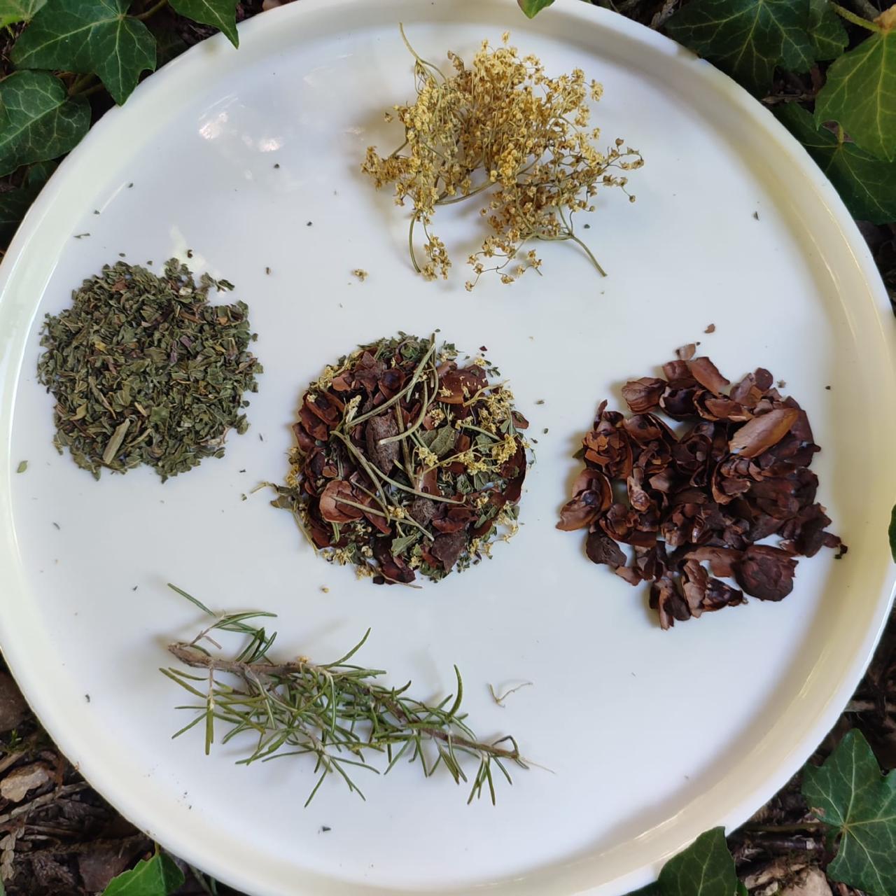 Ingrédients : écorces de fèves de cacao* torréfiées (77%), feuilles de menthe poivrée (8%), feuilles de romarin (8%), fleurs de sureau (7%).
