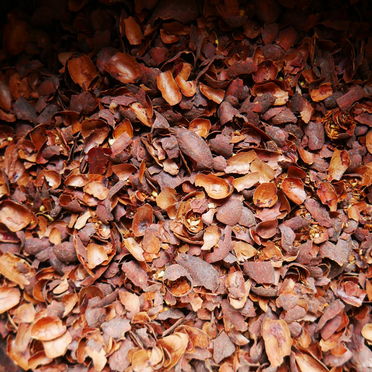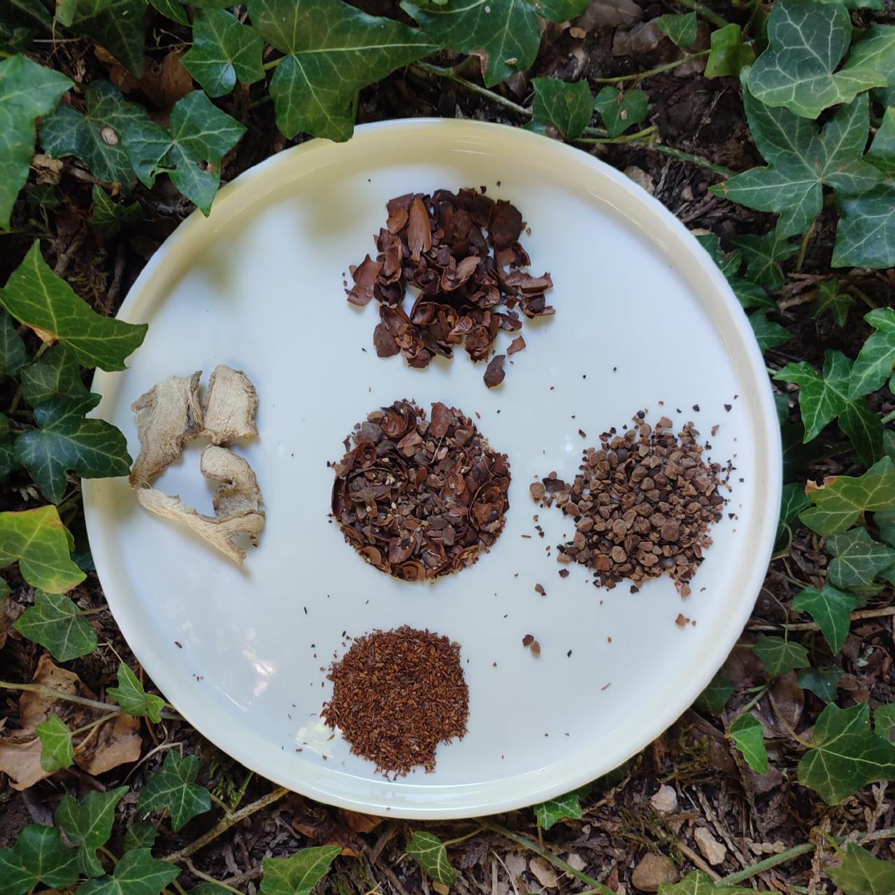Ingrédients : écorces de fèves de cacao torréfiées (60%), parties aériennes du rooibos (25%), graines de guarana (9%), rhizome de gingembre (6%).
