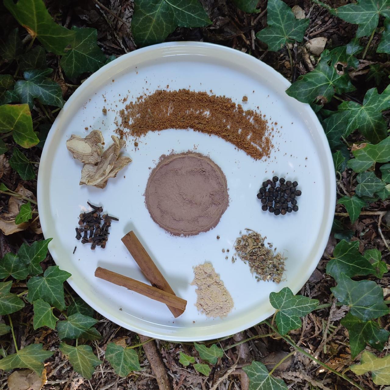 Ingrédients : cacao* cru** pur (55%), sucre de canne complet*** (22%), maca (10%), cannelle (5%), gingembre (4%), cardamome (3%), poivre noir (0,5%), clous de girofle (0,5%).