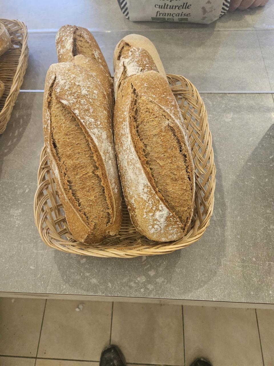 Pain rustique à la farine complète T150 biologique. Croûte épaisse, mie dense et savoureuse, riche en fibres. Idéal pour une alimentation saine et équilibrée.