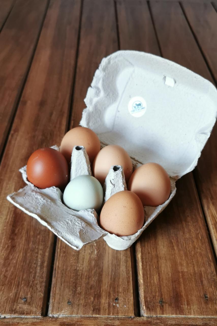 Boîte de 6 œufs de nos poules élevées en plein air. Certains œufs sont colorés (cela diffère en fonction de la race de la poule Marans, Azur... )