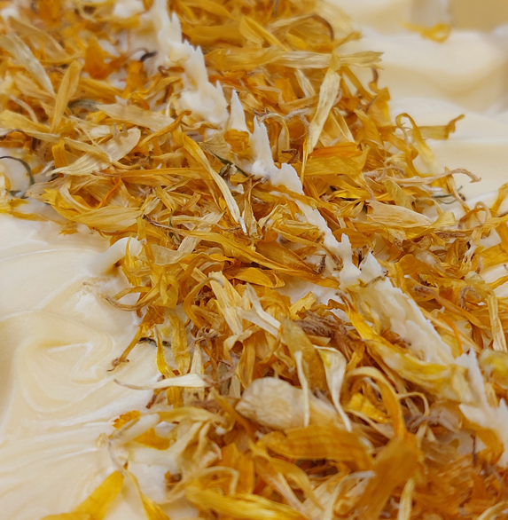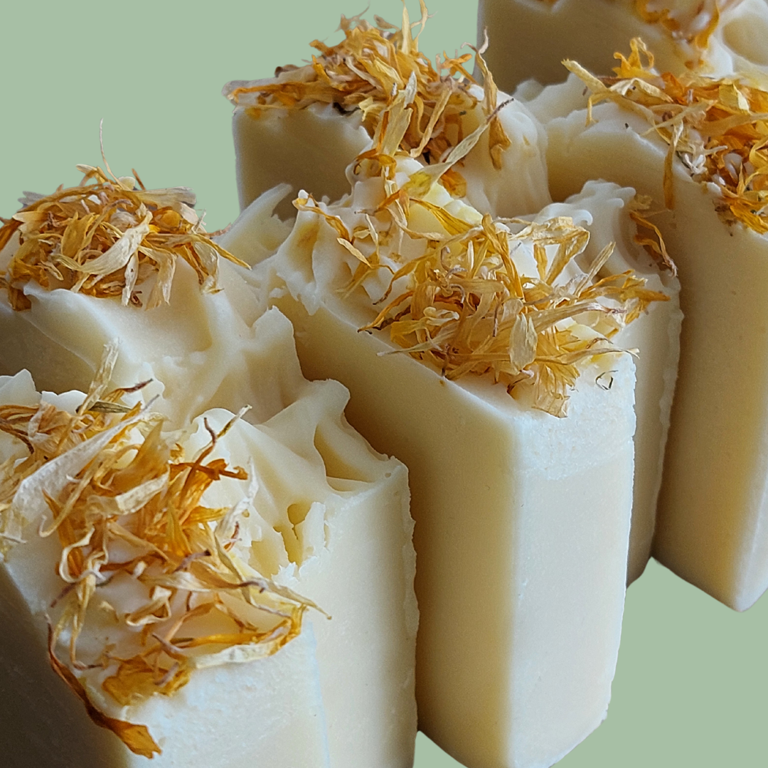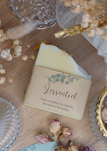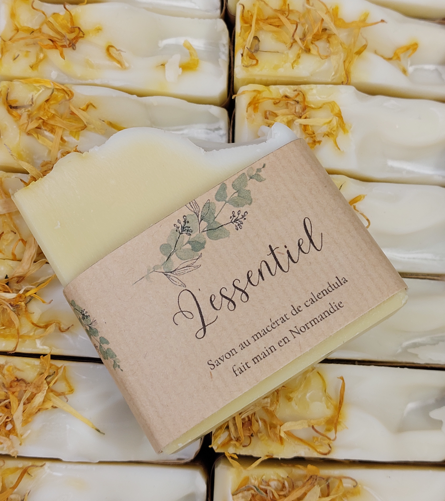 Ce savon surgras saponifié à froid, est composé d'eau et de soude, d'huiles et beurres végétaux : huile d'olive, huile de coco, macérat de calendula, huile de ricin, et de beurre de karité.