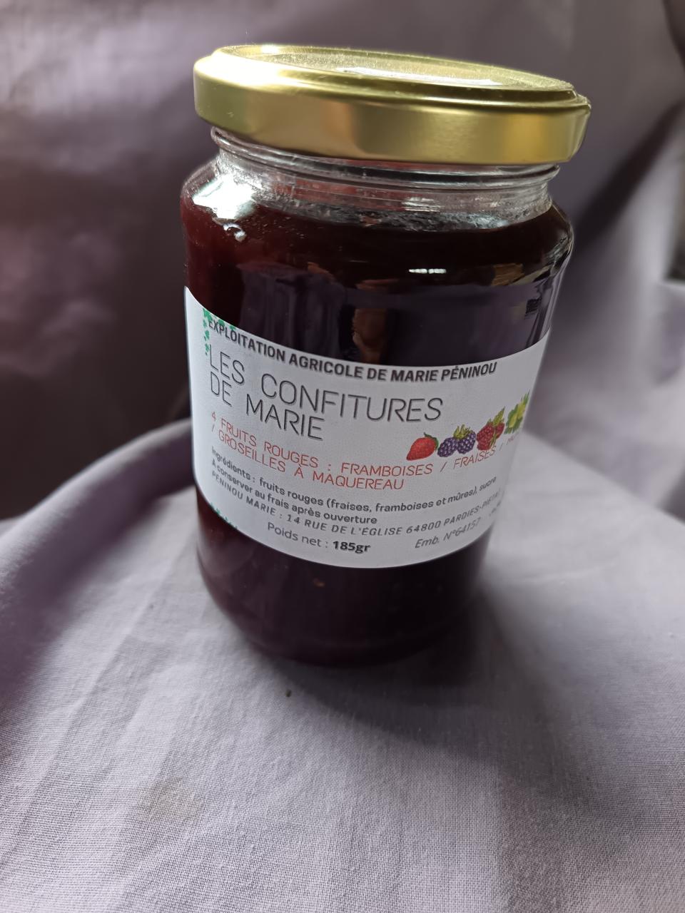 Confiture de 4 fruits rouges : fraises, framboises, mûres, groseilles à maquereau (produits issus de ma ferme en HVE, Haute Valeur Environnementale, et transformés par la ferme les Jardins d'Ossau)