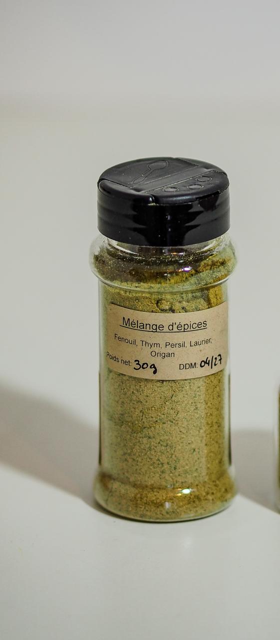 Plantes aromatiques cultivées et transformées sur site puis réduit en poudre dans un broyeur à épices après séchage. 100 % locale, sans utilisation d'engrais ni pesticides, sans ajout de sel.