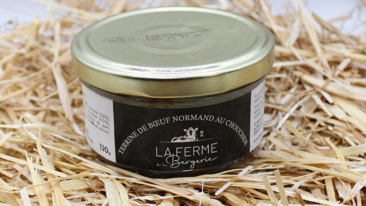 Terrine de bœuf composé de bœuf normand né et élevé à la ferme. Recette élaborée par nos soins et réalisée par un prestataire employant des personnes en travail adapté. Le bœuf et le gras de porc ont été préparés dans du chouchen pour lui donner un goût doux mais relevé.