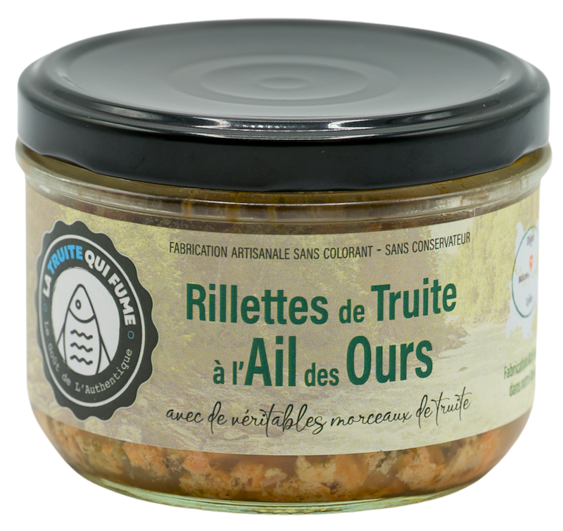 Ingrédients : Truite 70% (oncorhynchus mykiss)*, crème*, beurre*, cornichons, jus de citron, moutarde*, vin blanc (contient des sulfites*), oignon , sel, ail des ours 0,7%, agar-agar (gélifiant), poivre