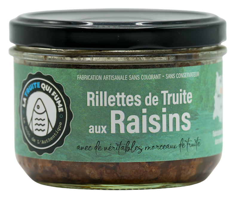 Ingrédients : Truite 67% (oncorhynchus mykiss)*, raisins 13,3%, crème*, beurre*, moutarde*, jus de citron, vin blanc (contient des sulfites*), oignon, sel, agar-agar (gélifiant), poivre