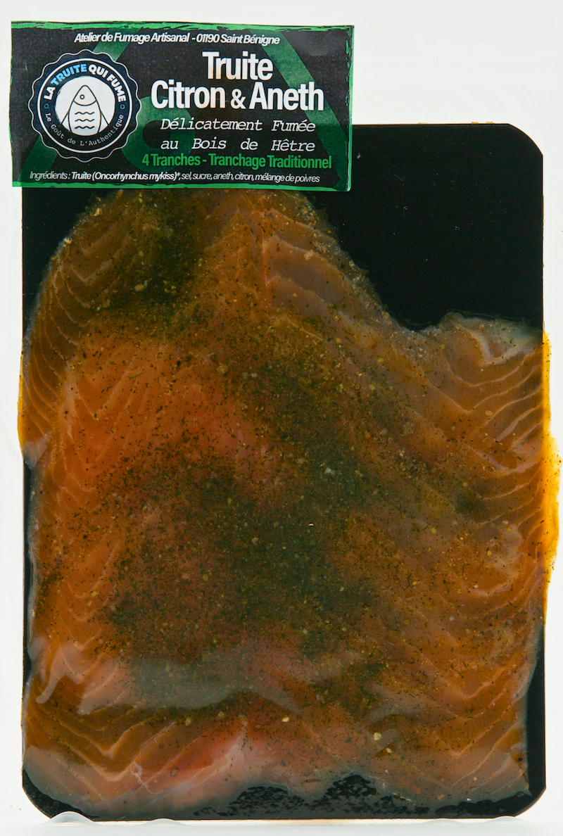 Allergènes : Truite (oncorhynchus mykiss) Conditionnement : Sous vide Durée de conservation : 30 jours Ingrédients : Truite (oncorhynchus mykiss), sel, sucre, citron, aneth, aromates Colorants ou arômes : Sans colorant, sans liant, sans conservateur Origine : France (Parc Naturel du Haut Jura)