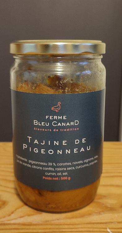 Ingrédients : pigeonneau 39%, carottes, navets, oignons, eau, jus de viande, citrons confits, raisins secs, curcuma, paprika, cumin, ail, sel