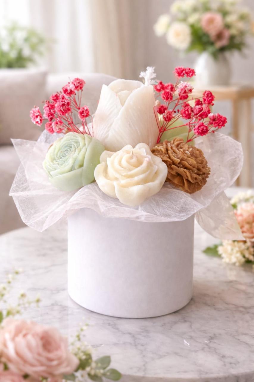 Composé de 6 fleurs fondants parfumés et d'une bougie tulipe avec 1 mèche en coton