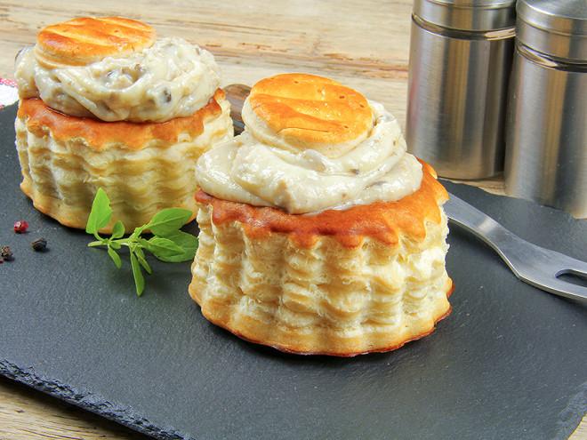 Ingrédients : Boudin blanc, dés de jambons, champignons émincés, béchamel (lait, beurre, farine, sel, poivre, muscade), feuilletage