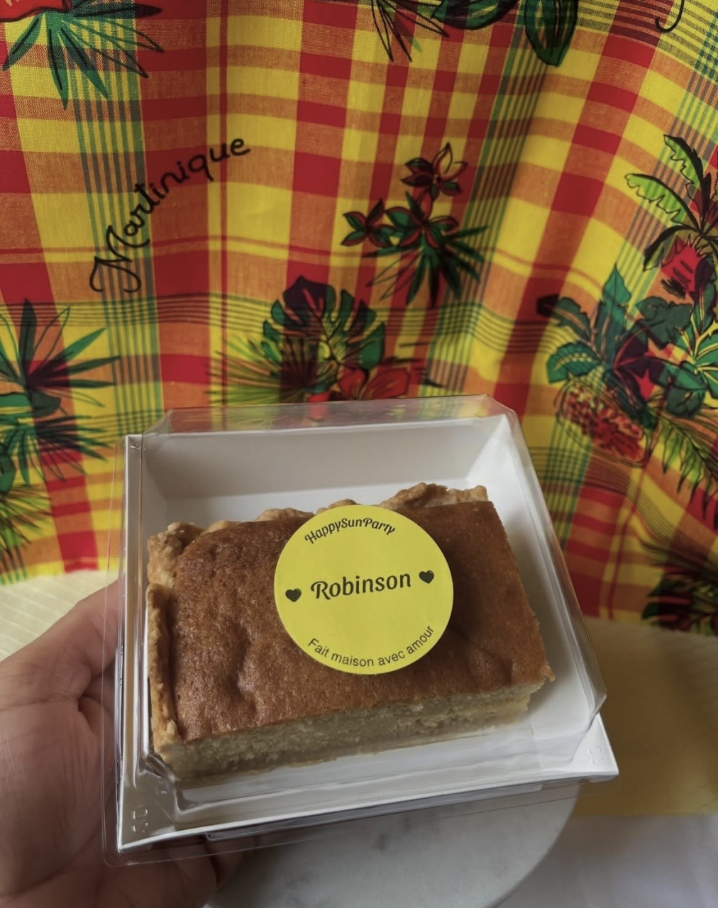 Il se compose d’une base en pâte brisée garnie d’une confiture généreuse coco & goyave ou coco & banane, apportant une douceur fruitée et parfumée. Le tout est recouvert d’un cake moelleux délicatement parfumé aux épices (cannelle, muscade) et sublimé par une touche de rhum vieux.