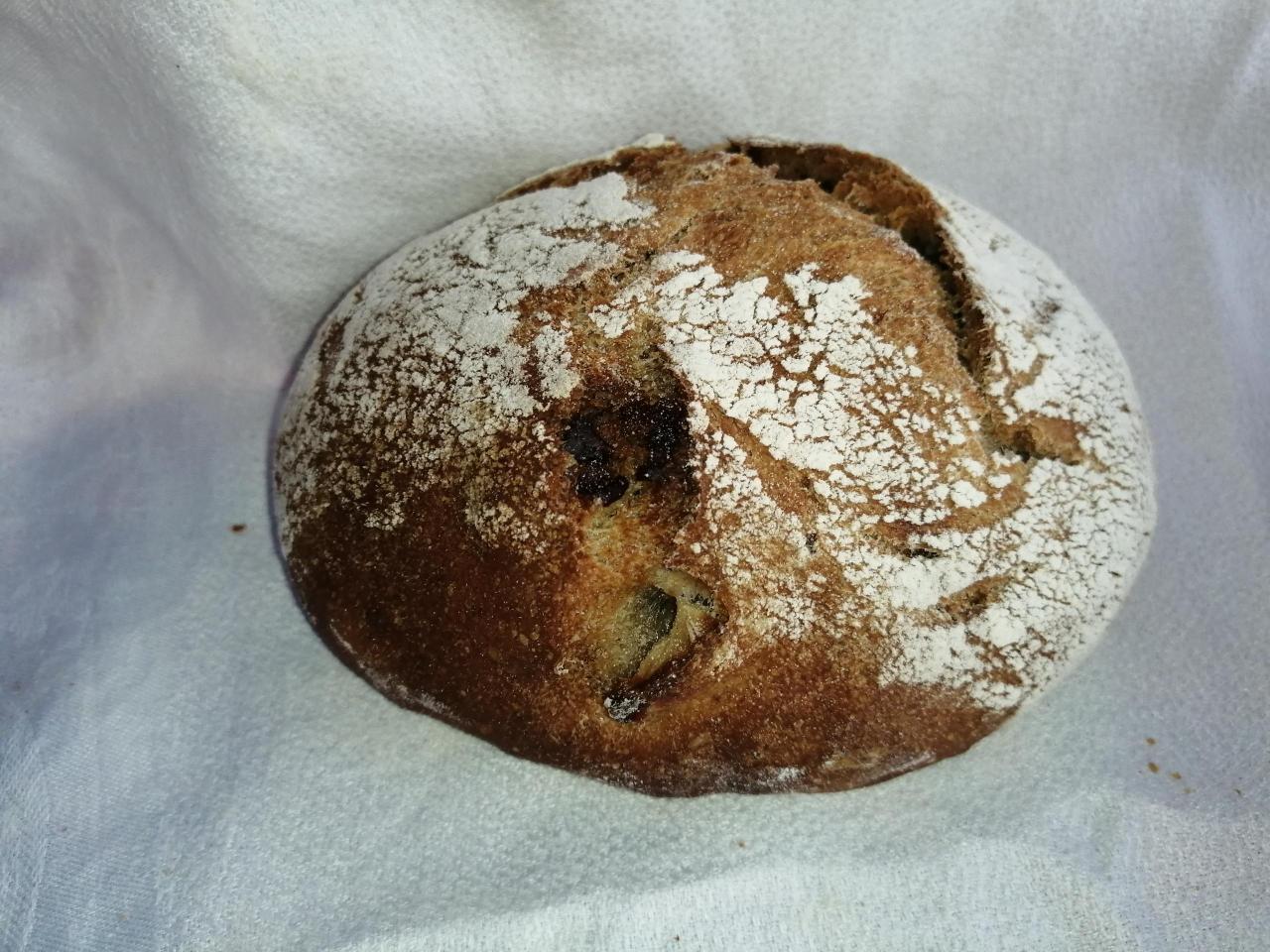 Ingrédients : farine blé t80, farine seigle, farine blé t65, levain de blé, sel, pommes, noix.