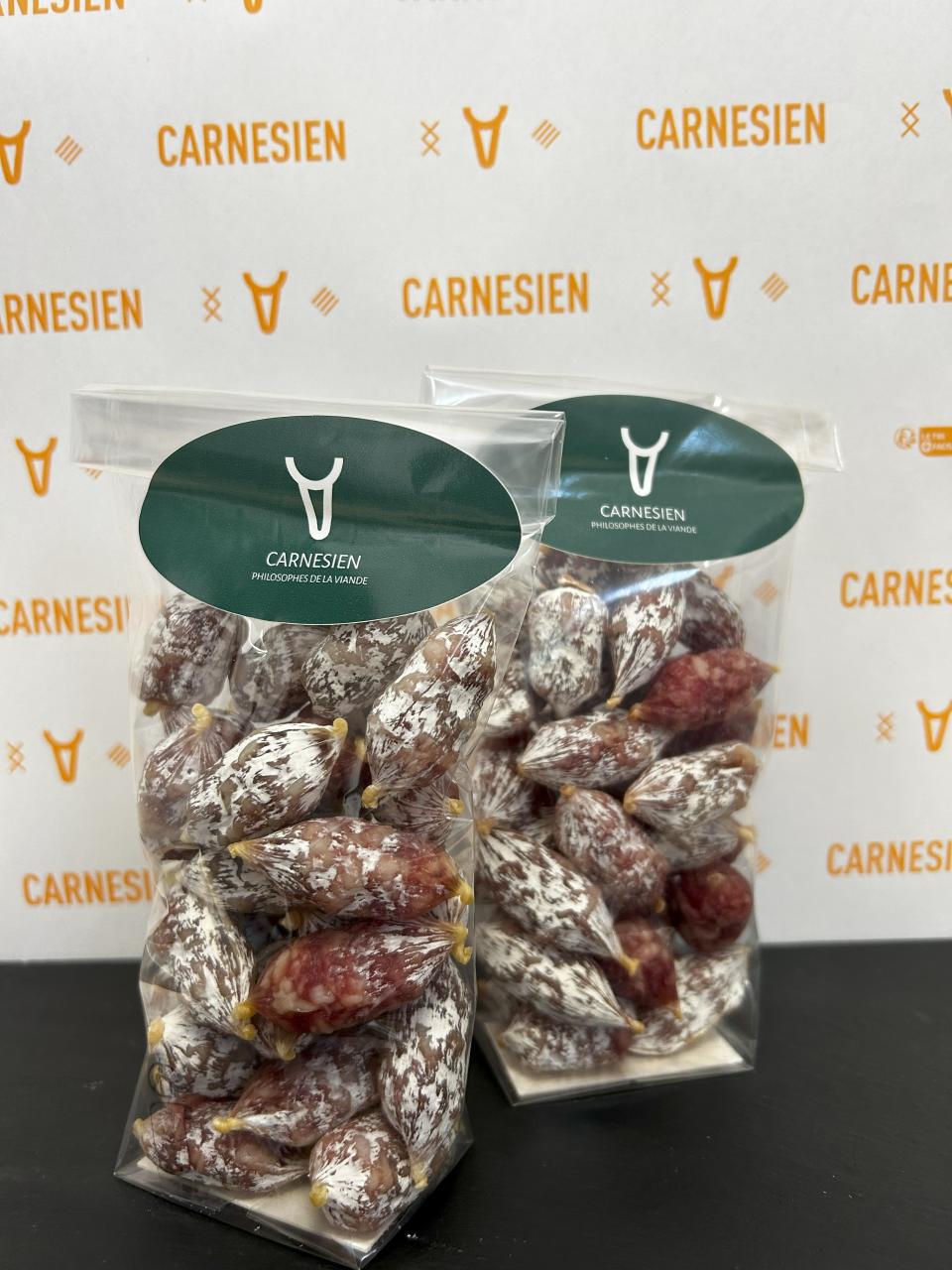 Saucisson sec de petite taille, le mini saucisson offre toute la saveur traditionnelle du porc fermier dans un format pratique. Sa texture ferme et son goût légèrement épicé en font un encas idéal pour l’apéritif ou les pique-niques.