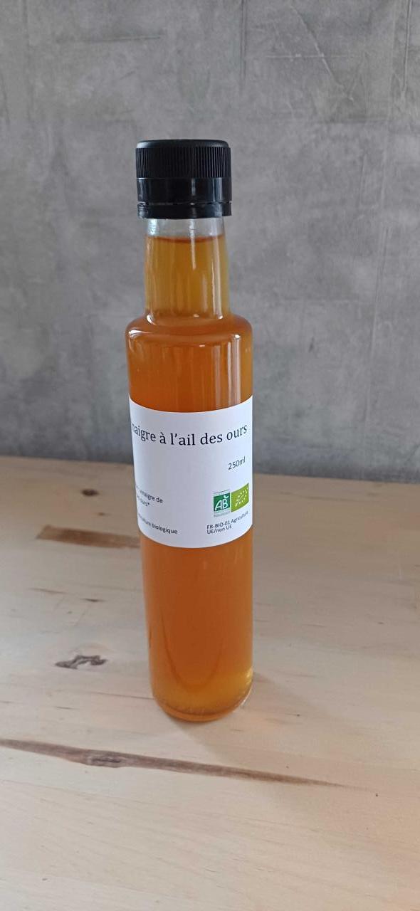 Vinaigre de cidre infusé avec de l'ail des ours bio de la région évidemment. A utiliser dans toutes vos vinaigrettes pour vos salades ou crudités diverses.