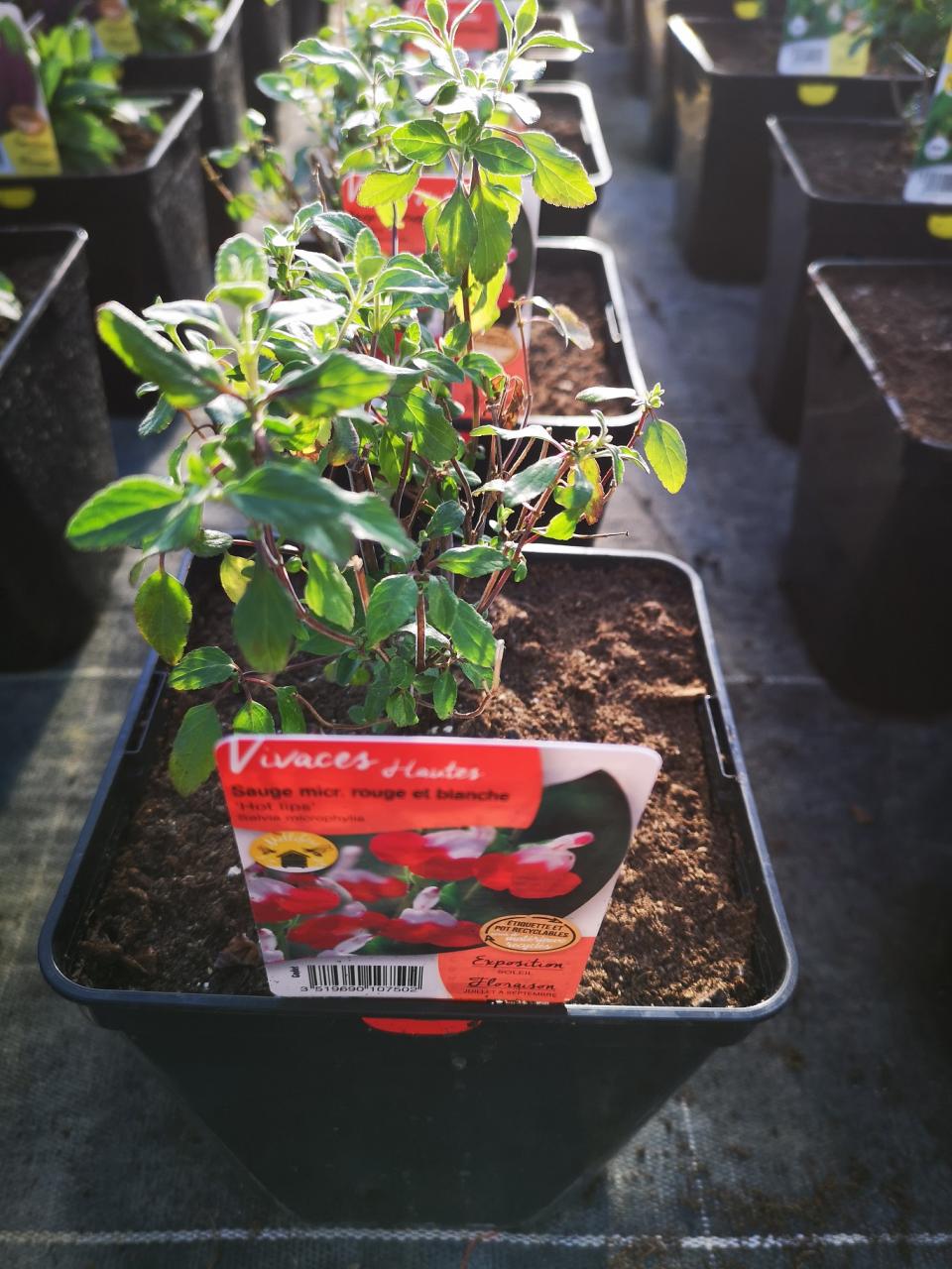 Sauge à fleurs rouge et blanc (actuellement non fleuri) en pot de 3 litres à planter au jardin. Vivace repousse chaque année.