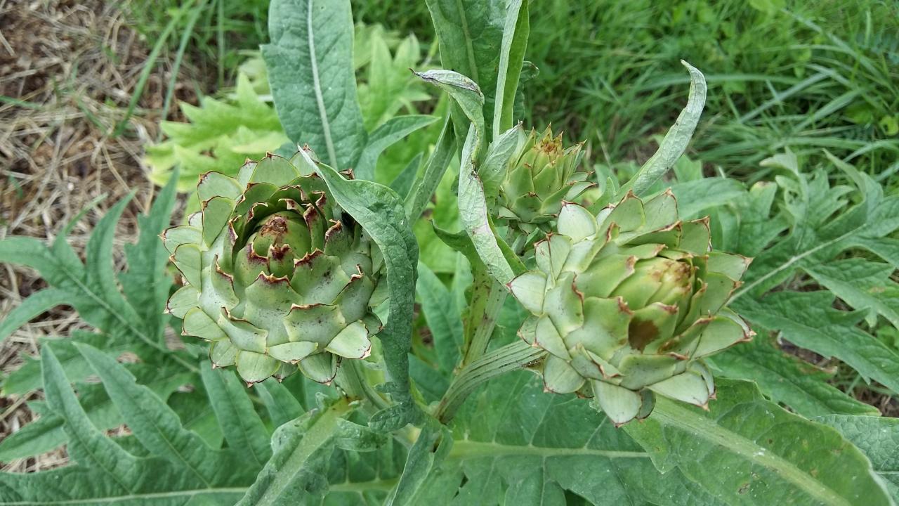 L'artichaut (Cynara scolymus) est une plante potagère pouvant mesure 1m, aux longues feuilles découpées pouvant mesurer 1m. Utilisation des capitules floraux en cuisine. Variété Imperial star, vigoureuse, précoce, pouvant donner 7 à 8 fruits ronds et uniformes par pied.