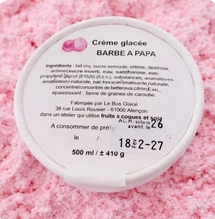 Ingrédients : Lait cru, sucre semoule, crème, dextrose, pâte aromatisante saveur barbe à papa(sucre inverti,eau,saccharose,eanpropylene glycol (E1520), (0,5%) substances aromatisantes naturelle,concentré de betterave, citron,E445, épaississant : farine de graines de caroube.