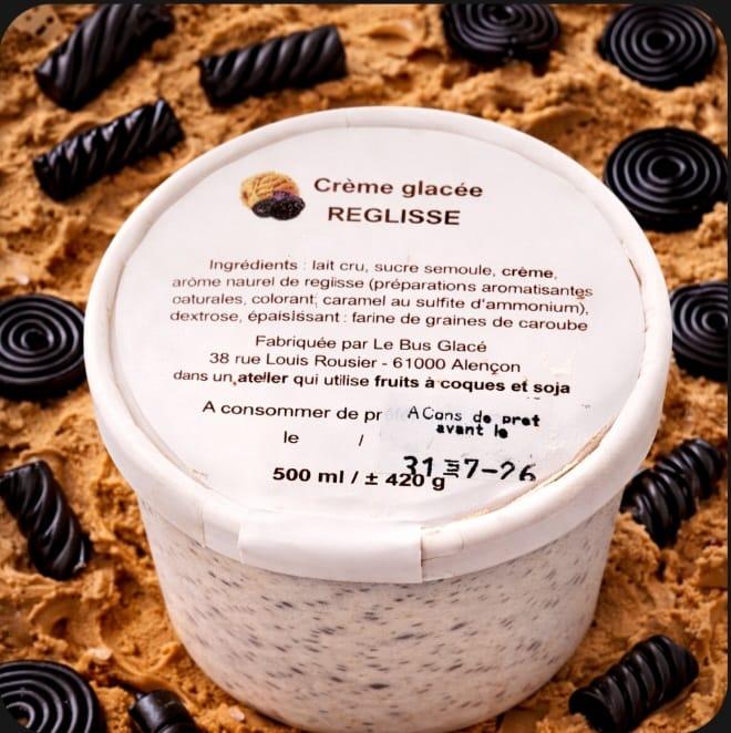 Ingrédients : Lait cru, sucre semoule, crème,arôme naturel de réglisse(préparation aromatisante caturale,colorant;caramel au sulfited'ammonium) dextrose, épaississant : farine de graines de caroube.