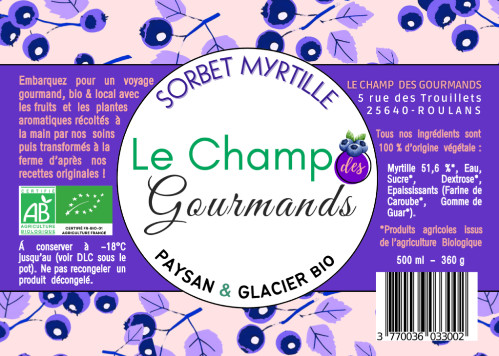 Surgelé Conditionnement : Pot 500ml Durée de conservation : 1 an Ingrédients : Myrtille de culture*, Sucre*, Dextrose*, Épaississants (farine de caroube*, gomme de guar*).