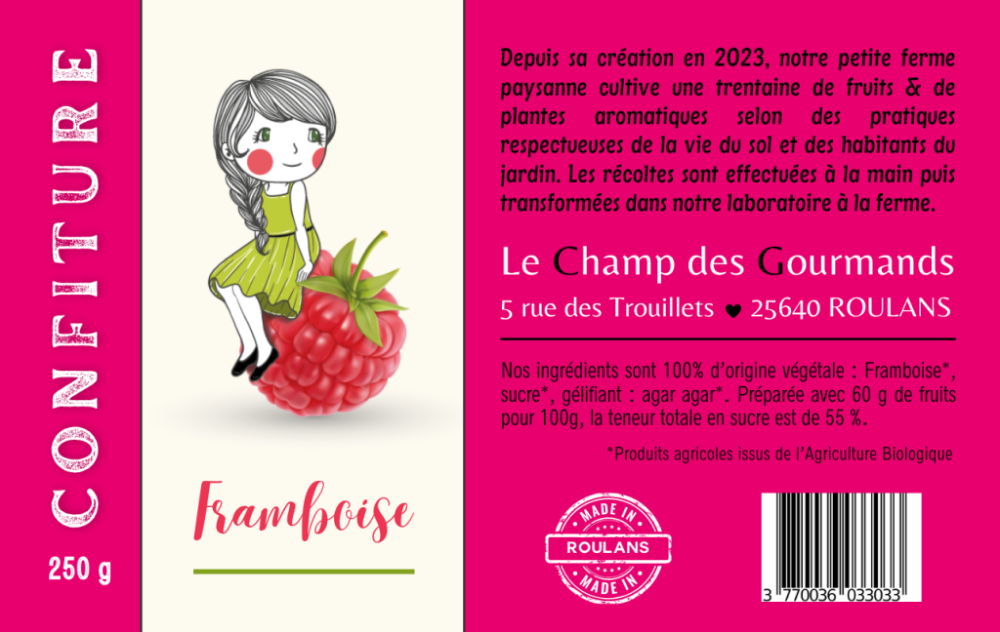 Ingrédients : Framboise* de la ferme cueillie à pleine maturité, sucre*, agar-agar*.