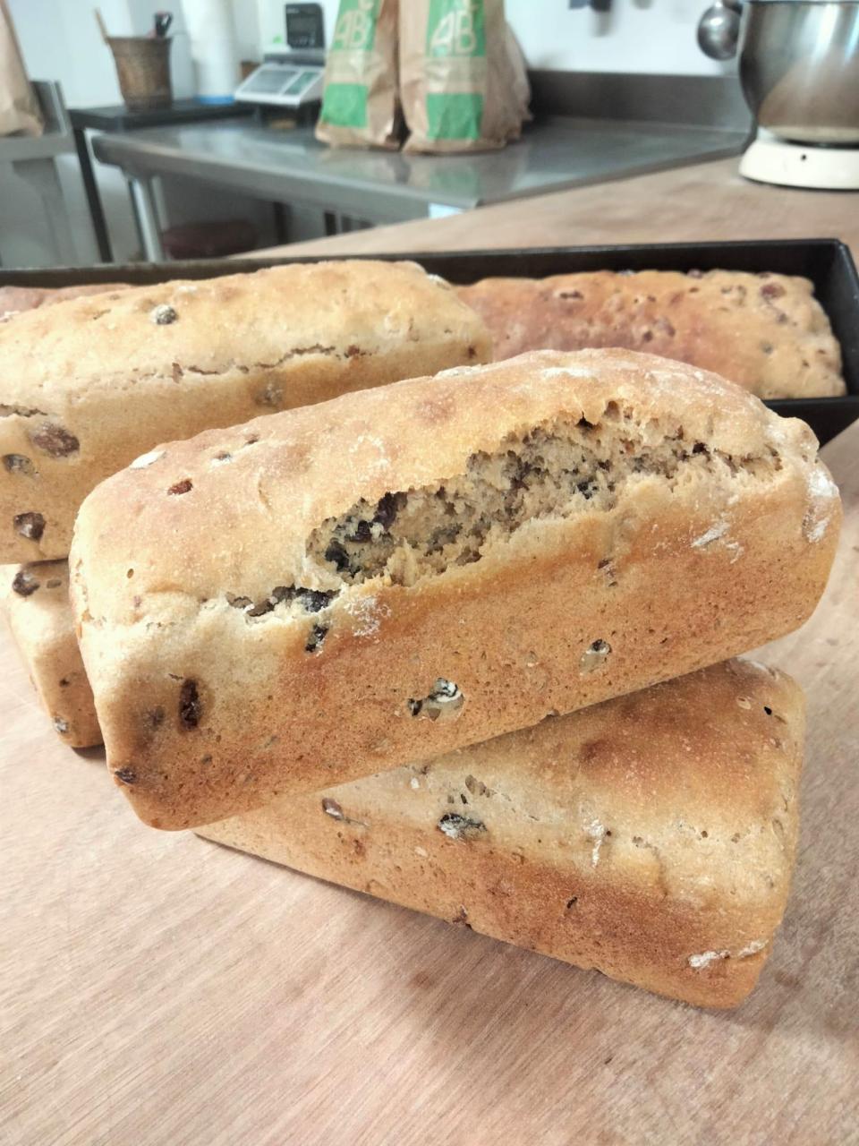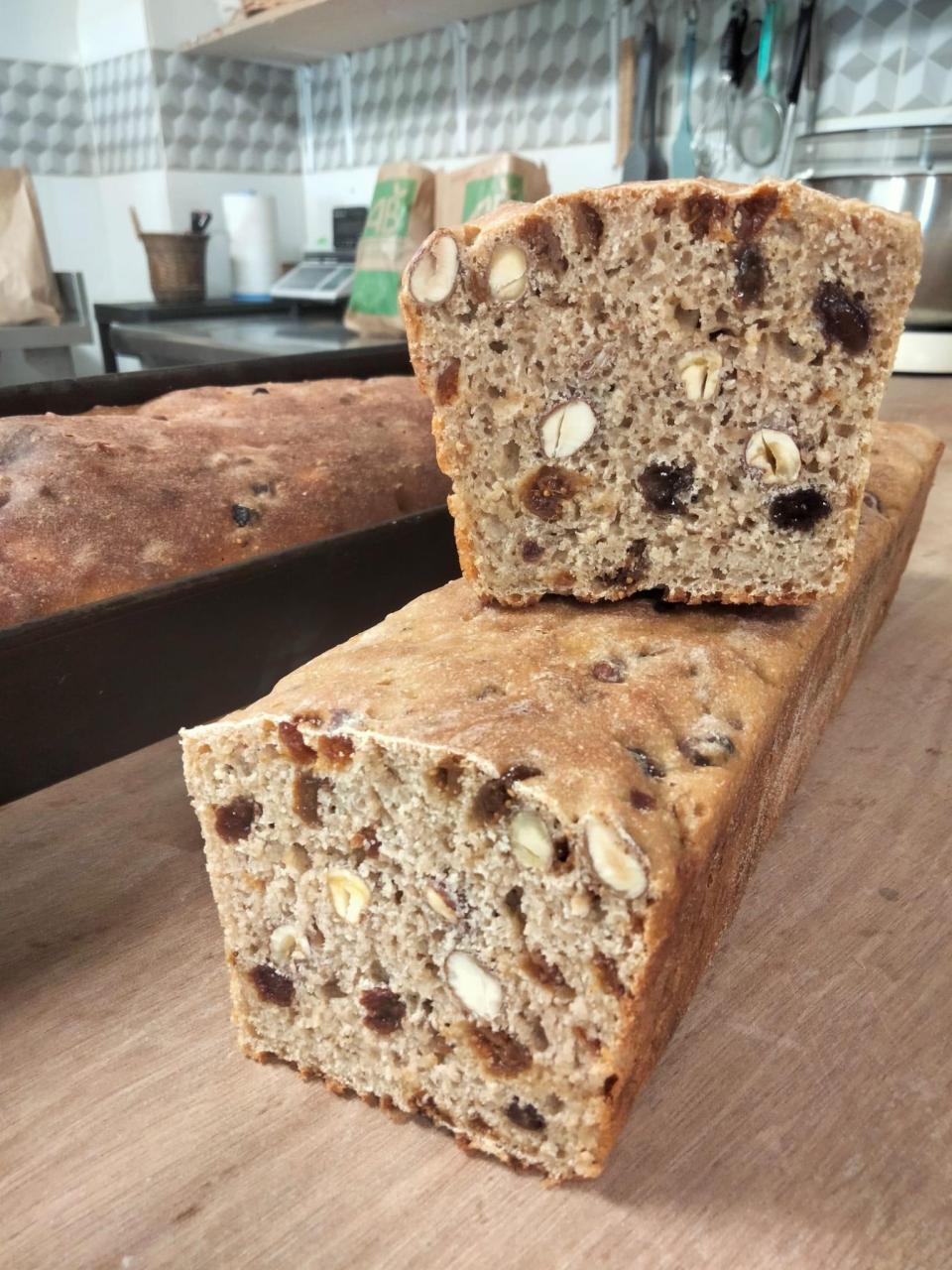 Pain au grand épeautre bio au levain naturel de petit épeautre, noisettes, figues, abricots, raisins.