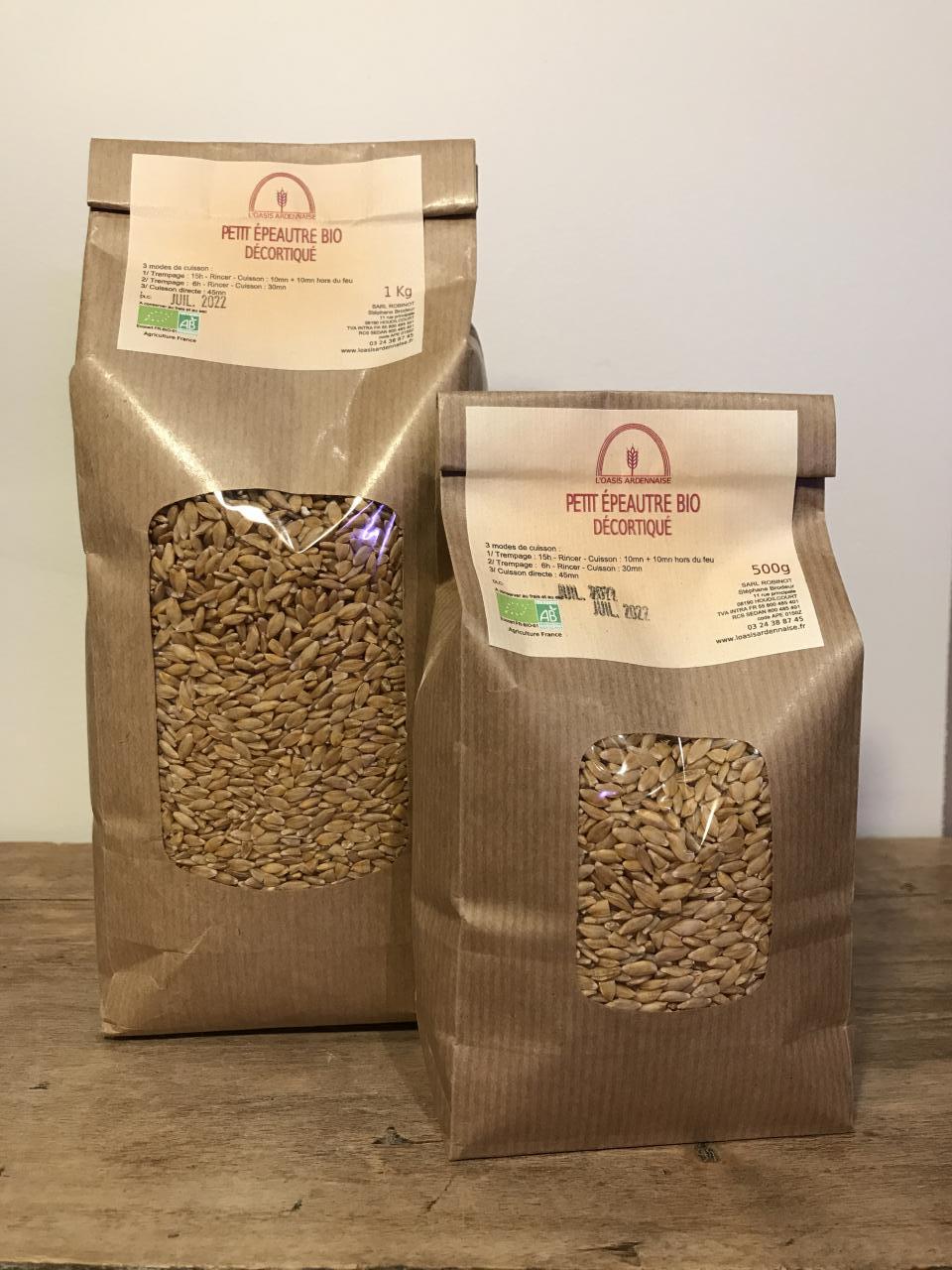 Allergènes : Gluten Conditionnement : sachets de 500g Durée de conservation : 36 mois à partir de la date de fabrication (DLUO sur l'emballage) Ingrédients : Petit épeautre BIO Colorants ou arômes : 0 Origine : Houdilcourt 08190