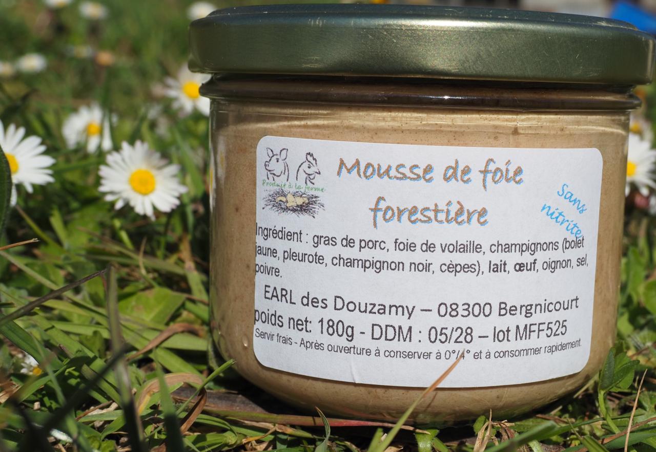 Bocal de 180g de mousse de foie forestière transformé et stérilisé à la ferme.