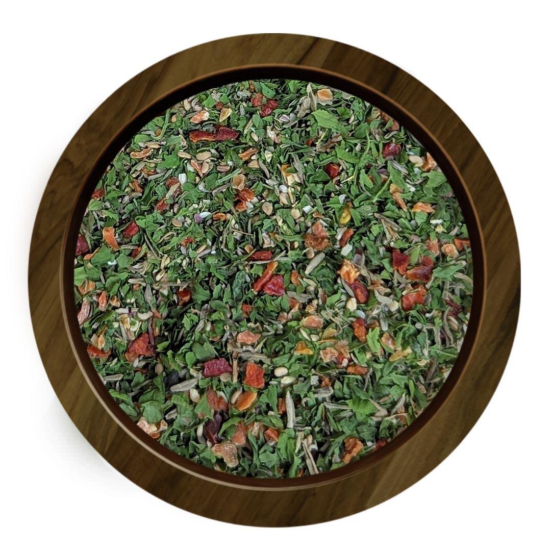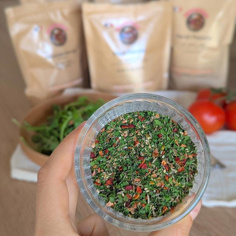 Les épices pour salade, c'est la solution pour ceux qui veulent manger des salades ou crudités sans sacrifier leur plaisir. Ce mélange associe herbes aromatiques séchées et morceaux de légumes déshydratés pour transformer instantanément vos salades en créations qui donnent vraiment envie. Que ce soit en topping directement sur vos salades ou pour parfumer votre vinaigrette, une bonne cuillère à soupe de ce mélange suffit à apporter instantanément complexité aromatique, touche visuelle colorée et relief gustatif à vos salades en tout genre !