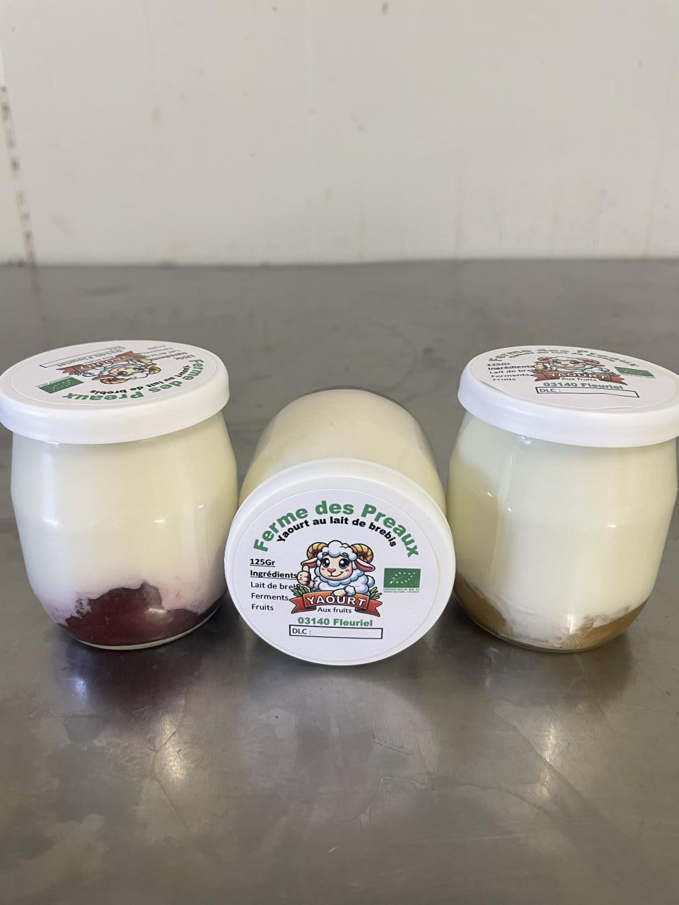 Yaourt au lait de brebis sur lit de coulis aux fruits doux et crémeux : fraise, myrtille, framboise, citron, abricot, pomme-cannelle et vanille.